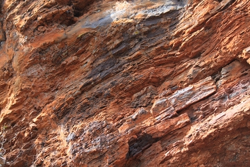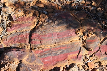 Banded Ironstone Formation rocks and outcropping, exposed via the uplifting and weathering, can consist of blue, steel grey or black bands of colour, rich in magnetite – haematite as well as red jaspilite bands and white quartz. Sometimes the jaspilite bands dominate and, at the other end of the scale, some rocks appear to have no jaspilite bands and are entirely steel grey or grey-black.