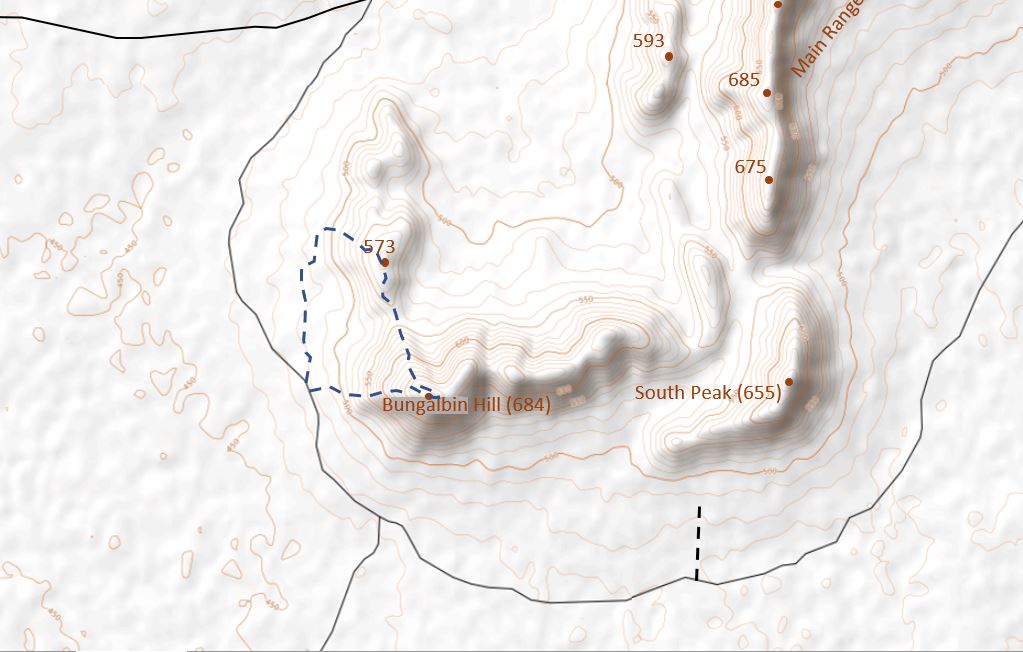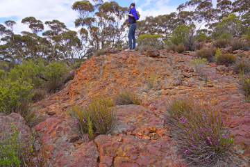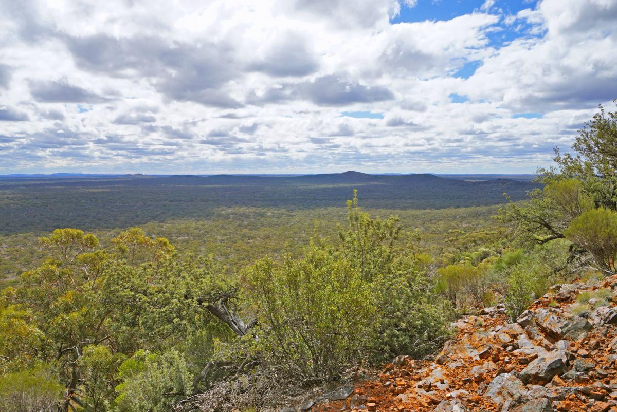 The route starts from the main vehicle track heading north around the range; just park up safely off the track and take care to cause no damage. After only a short warm-up, the route makes a steep and direct ascent up the west ridge of Bungalbin Hill. The ground is rough under foot, but there are a number of small rock ledges which open up extensive views to the north and west.
