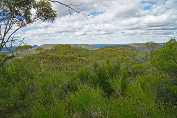 From the peak, the route heads steeply down the mostly open north ridge with great views in all directions. After a low saddle a gently rising ridge leads to a small rounded peak that marks the end of the Main Range Ridge. Heading to the NW from this peak, views open up once again over the western hills. The J5 area is close-by, and it is easy to imagine the destruction to the wilderness values in this area that would have been wrought if the proposal for iron ore mining had been permitted. An old exploration track is followed down the NW slope before a final short off-track section back to the start.