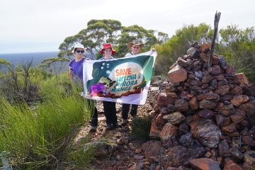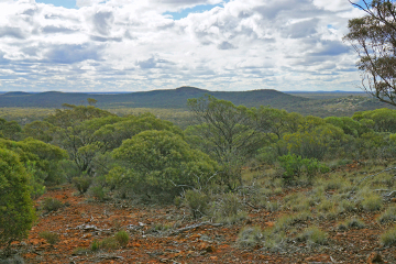 The summit of Bungalbin Hill itself is marked by a large cairn but it is mostly shrouded in vegetation which prevents any clear views. However, it pays to wander off the summit itself and make a short circuit around the peak area, just where the steeper drop-off starts. Views in various directions can be obtained, including over the Main Range Ridge to the east and NE and also towards Lake Deborah and the Koolyanobbing Range on the horizon 50 km to the south.
