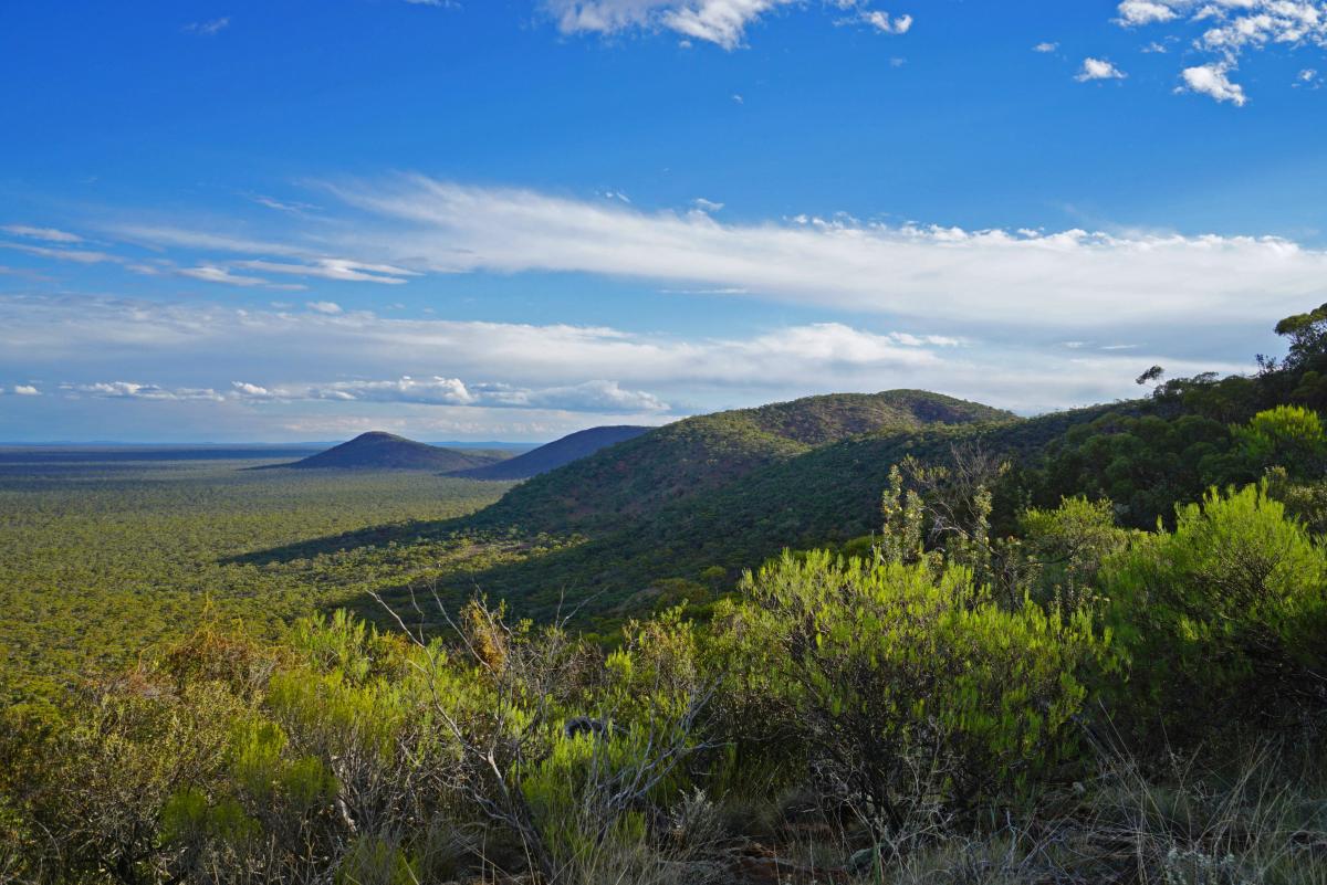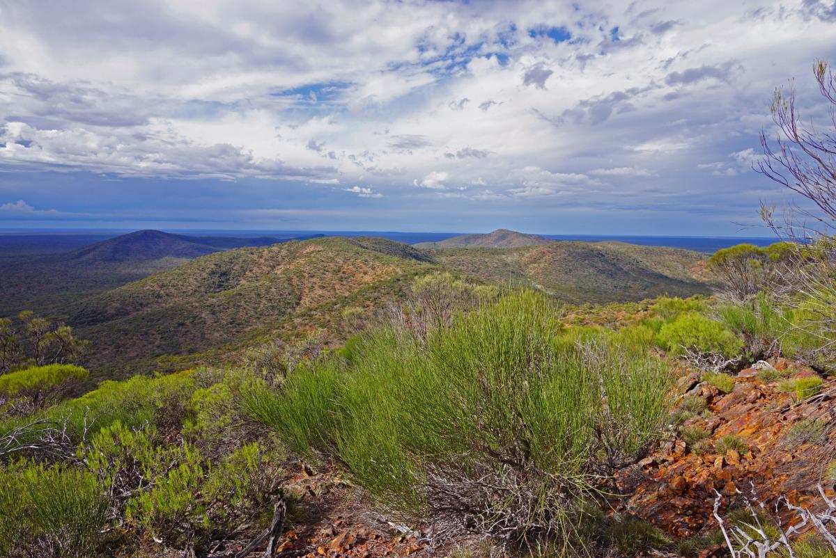 From the saddle, the steep north ridge of Bungalbin Hill is ascended, which offers fine views out to the east over the highest part of the range, and also out to J5 in the NW (which has been saved from becoming an open mine pit) and to Mt Jackson on the horizon further west. The summit of Bungalbin Hill itself is rounded and mostly shrouded in vegetation – so no great vistas from the summit itself. However, a large cairn (the only one in the range) marks the highest point.