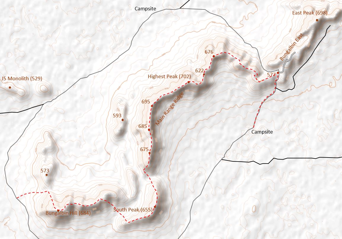 A lovely spot for lunch! Now follow the ridge downhill to a saddle, first SE and then in a generally NE direction, before ascending once again to another couple of high points. The ridge then continues SE clambering down and up one further high point, before finally starting the long descent to the vehicle crossing saddle that separates the central Main Range Ridge from the Bungalbin East ridge.