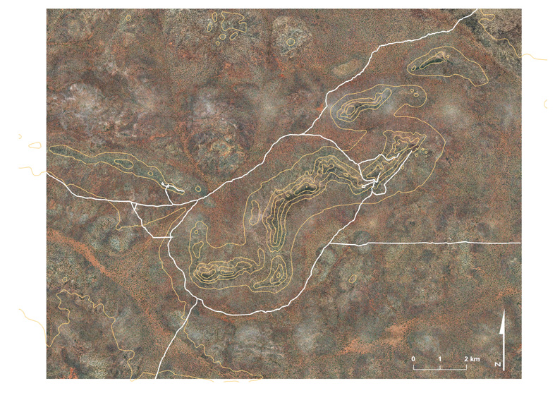 A contour map of the main range of Helena and Aurora Range, Bungalbin with tracks set on aerial photography has been put together for us by Amanda Keesing. The aerial photography was purchased from Landgate. The main range lies in a north-east direction. We have presented this beautiful map firstly with no explanatory text, then as two maps with explanatory notes.