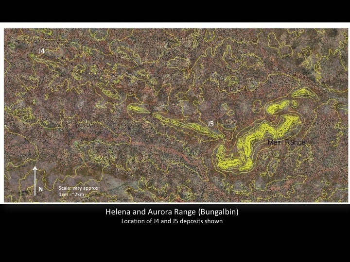 Helena and Aurora Range, Bungalbin includes the main range, a group of convoluted tall BIF ranges lying in a north-east direction, and a more or less straight length of low BIF ranges lying in a north-west direction, starting north of the south end of the main range and finishing near the east end of the Mt Jackson Range. The low BIF hills include iron ore deposits referred to as J5 and J4 (mined). These hills are intrinsically linked (not just by name) as they support the same vegetation type, open Eucalyptus over Neurachne annularis grasslands, and feed in to the same watercourses.