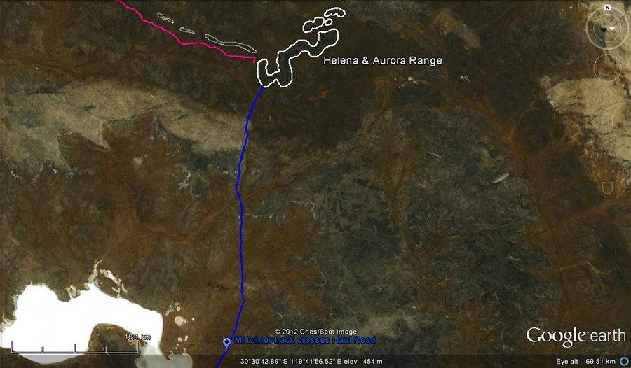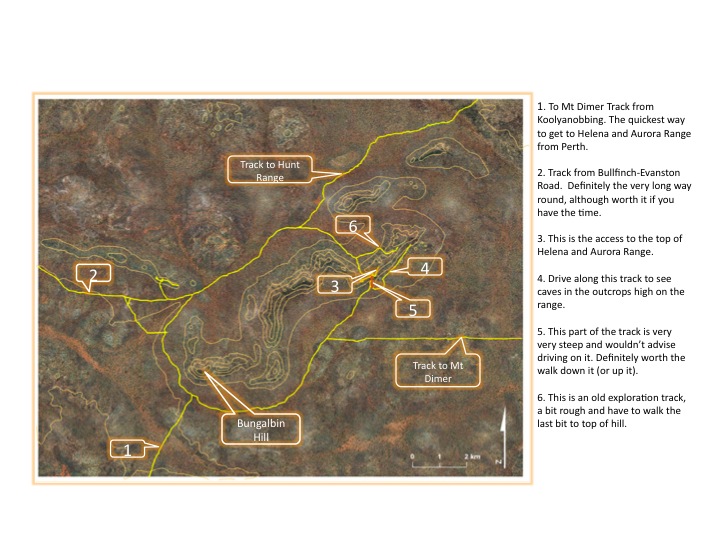 At Koolyanobbing you travel ~1 km past the Koolyanobbing 'workers village' towards K Pit, turning sharp right before the pit (is the first right turn available after the main entrance to the workers village). After another ~1 km you will come to a Stop sign at a haul road (to K Pit); Cross the haul road and then almost immediately there will be a track on your left saying To Mt Dimer. Take this track as it will take you to Helena and Aurora Range.