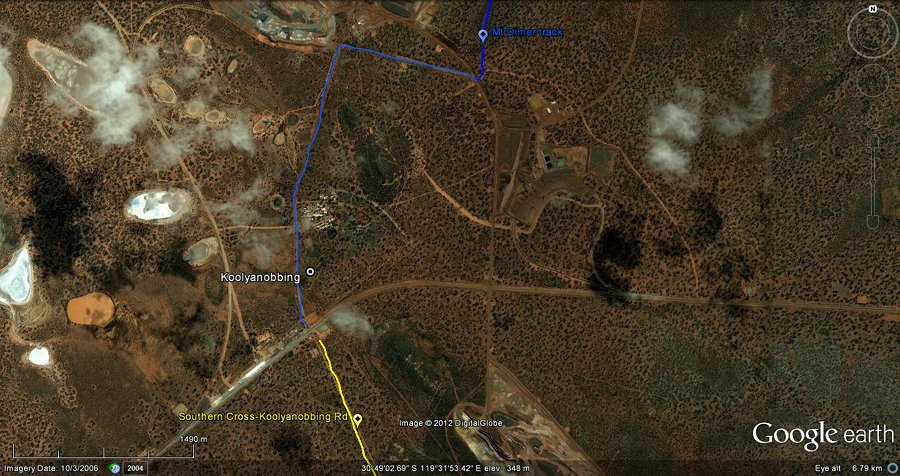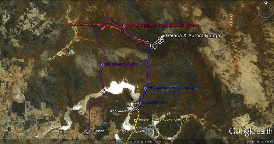The four maps below, developed using Google Earth, are to give a broad view of where Helena and Aurora Range, bungalbin is in respect to main tracks, other ranges and Koolyanobbing. Please use maps in a travellers atlas or topographic maps available from map stores (1:250,000 or 1:100,000) to navigate your way to Helena and Aurora Range, Bungalbin. The most direct route to Helena and Aurora Range, Bungalbin is from the Great Eastern Highway then via Southern Cross and Koolyanobbing. A detailed map of the route via Koolyanobbing is provided below these four Google Earth maps.