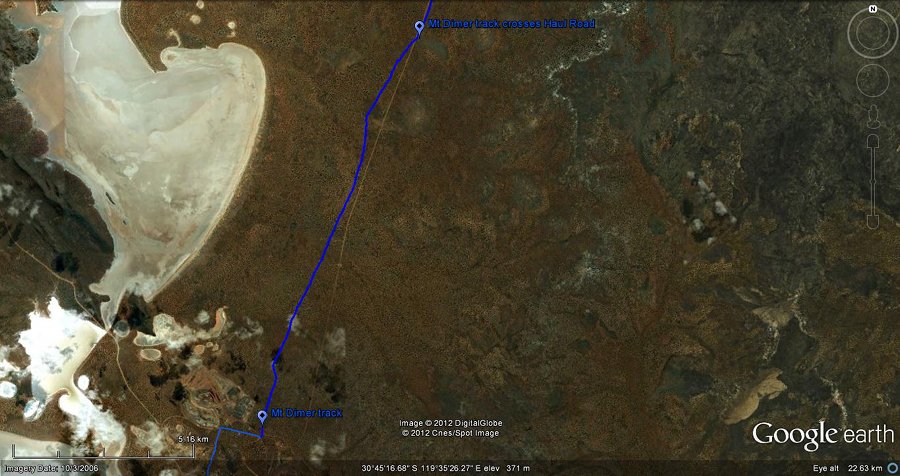 The track to Mt Dimer crosses the Koolyanobbing-Windarling Haul Road (with Stop sign); once crossed the track follows parallel to the Haul Road for a while until the Haul Road eventually veers away to the west.