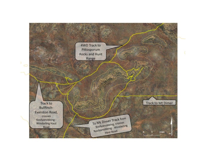 North-East Track - a track that continues north-east, past the turn off in to the Range (on the north side), to arrive at Pittosporum Rock, Kurrajong Rock and Hunt Range. This track joins other tracks to Mt Manning, Menzies, Mt Finnerty and Jaurdi Station.