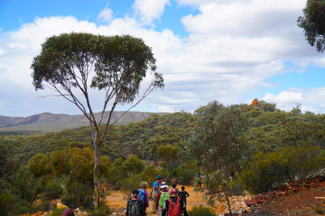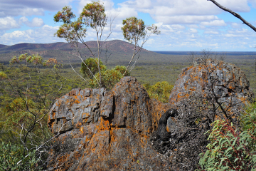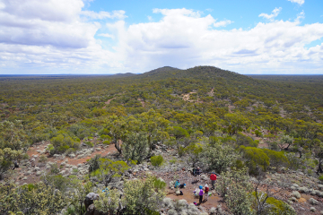 Looking from below, the West Peak looks unassuming and lacking interest, but on arrival at the rocky summit a magnificent 360 degree vista unfolds – indeed the only significant peak in the entire range with a full 360 degree panoramic view. To the west is the Mt Jackson Range, while dominating the skyline to the east lies the entire main Helena Aurora Range. On the horizon to the North are the Die Hardy and Mt Manning Ranges and far to the south, over a vast expanse of flat sand plain, is the Koolynobbing Range and Lake Deborah.