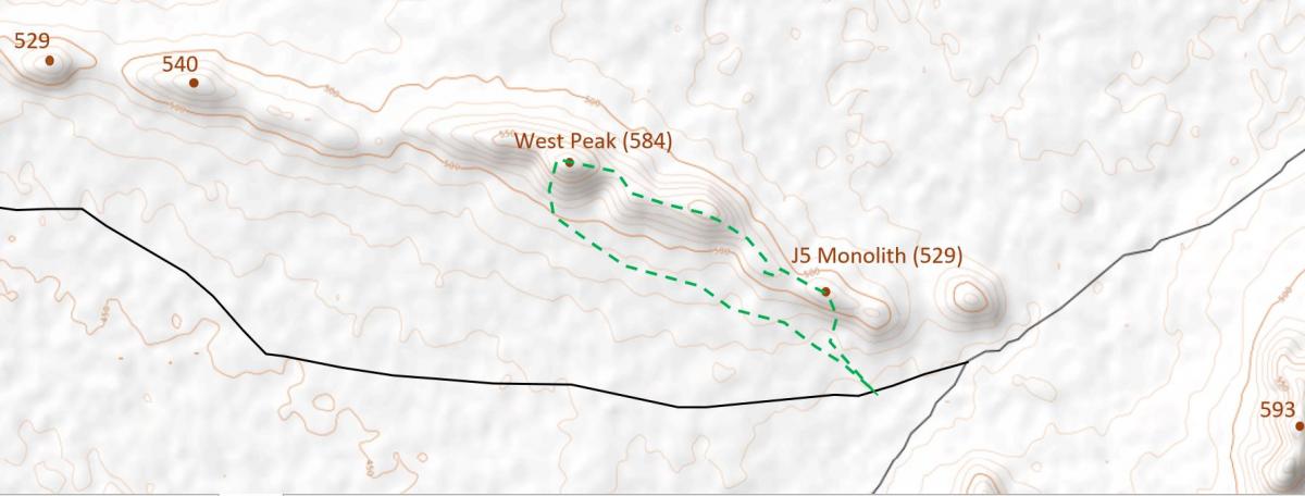 The ridge line continues to drop, eventually reaching a saddle before the rise to the J5 monolith. Around here there is a clutter of mining exploration tracks – a stark reminder that this area, including the magnificent J5 monolith, was all earmarked to become an unsightly hole in the ground.
